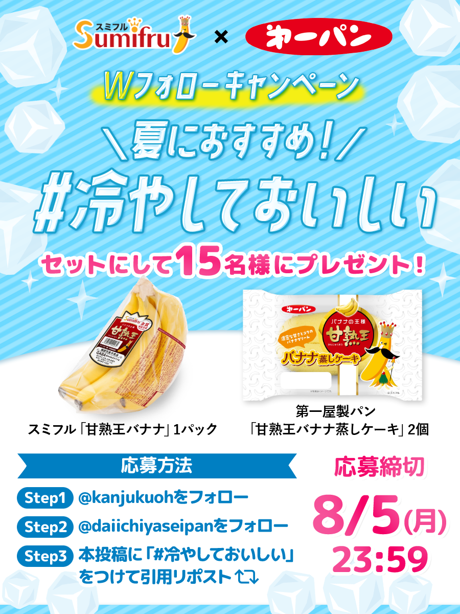 スミフルジャパンと第一パンの2社合同で、「#冷やしておいしい」プレゼントが当たるWフォロー&リポストキャンペーンを実施いたします。