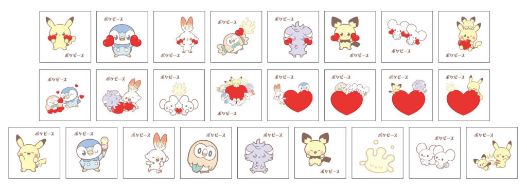 本商品にはキラキラ仕様の「ポケピース特製シール」がパンと一緒に1枚封入されております。シールのデザインは、前回からデザインを一新。思わず集めたくなる全25種類のシールです。