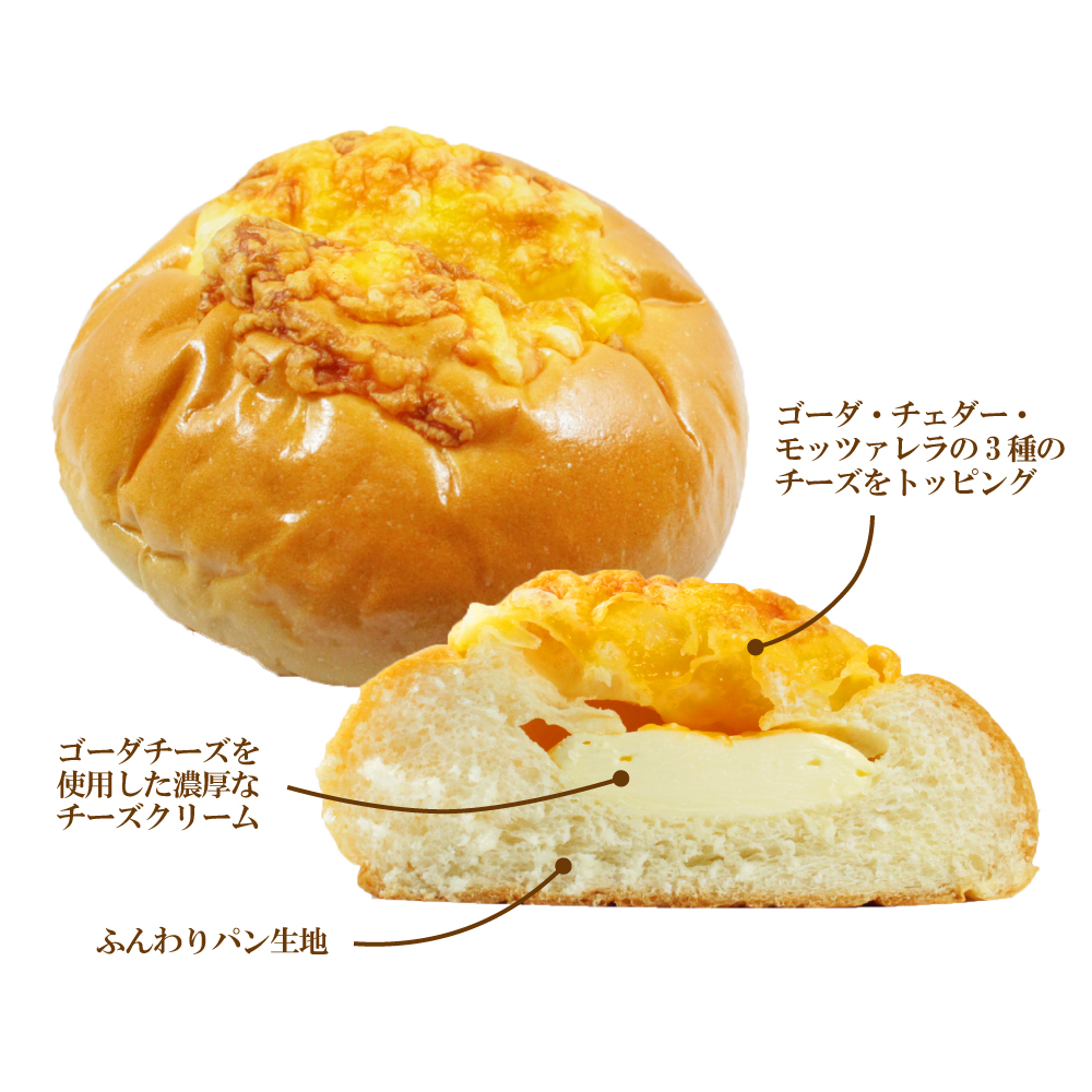 ふんわりとしたパン生地でゴーダチーズ入りチーズクリームを包み、表面にゴーダ・チェダー・モッツァレラの3種類のチーズをトッピングして焼き上げました。